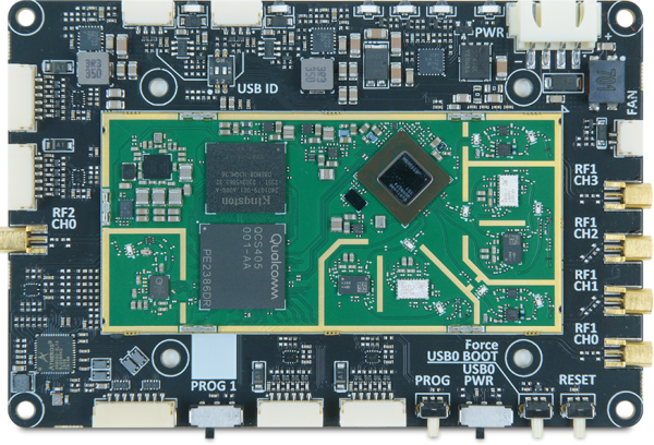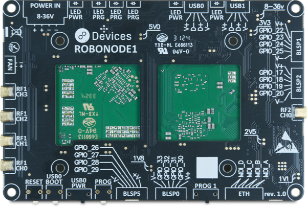 Robonode is a long-range, low-latency data radio built on the Qualcomm® QCS405 SoC and QCN9074 radio chip with 2360-3150 MHz and 4550-6630 MHz radios. Pre-loaded Robosoft firmware delivers powerful features like FEC, fast frequency shifting, and an improved IEEE 802.11ax implementation. These features make it a powerful solution for high-performance unmanned system projects.