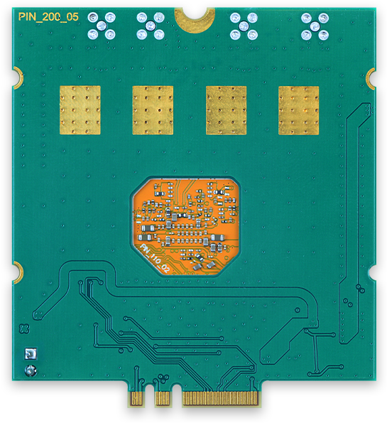 The Pineapple 2 uses the highly capable Qualcomm QCN9074 chip to deliver Wi-Fi 6 2400-2500 MHz connectivity, 4×4 MU-MIMO, and maximum data rates of 1200 Mbps. The radio supports 28 dBm RF power per chain and 20 and 40 MHz channel sizes. When combined with the Mango SoM, Pineapple supports both FirmUx and OpenWrt.